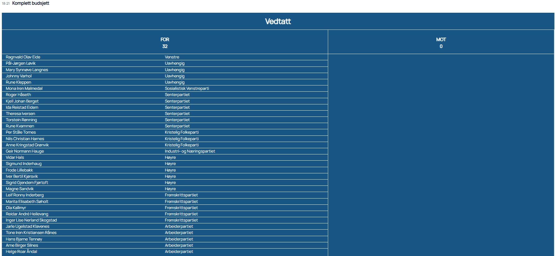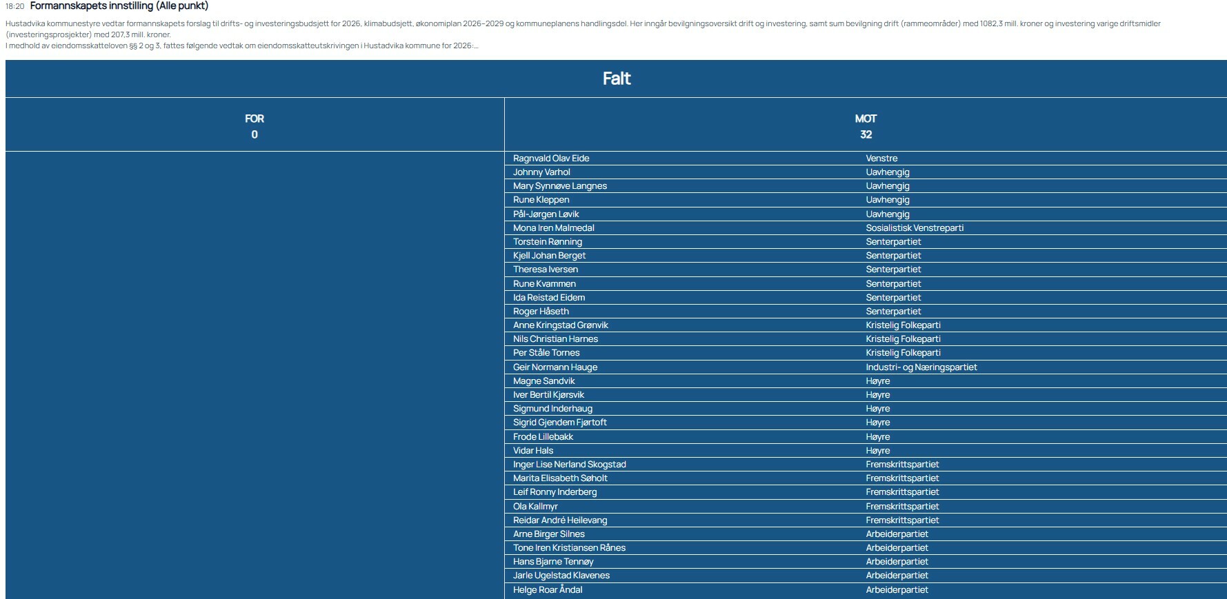 1. Hustadvika kommunestyre vedtar formannskapets forslag til drifts- og investeringsbudsjett for 2026, klimabudsjett, økonomiplan 2026–2029 og